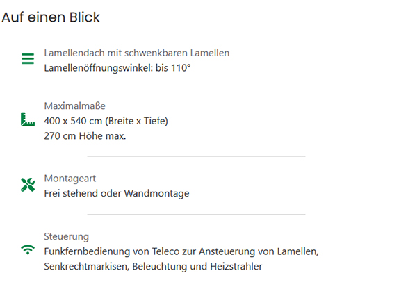 Die Ausstattung lässt sich flexibel an Ihre Wünsche anpassen. Zusätzliche Elemente wie Beleuchtung und Sensoren können optional ergänzt werden, sodass Ihr Lamellendach immer genau Ihren Bedürfnissen entspricht.